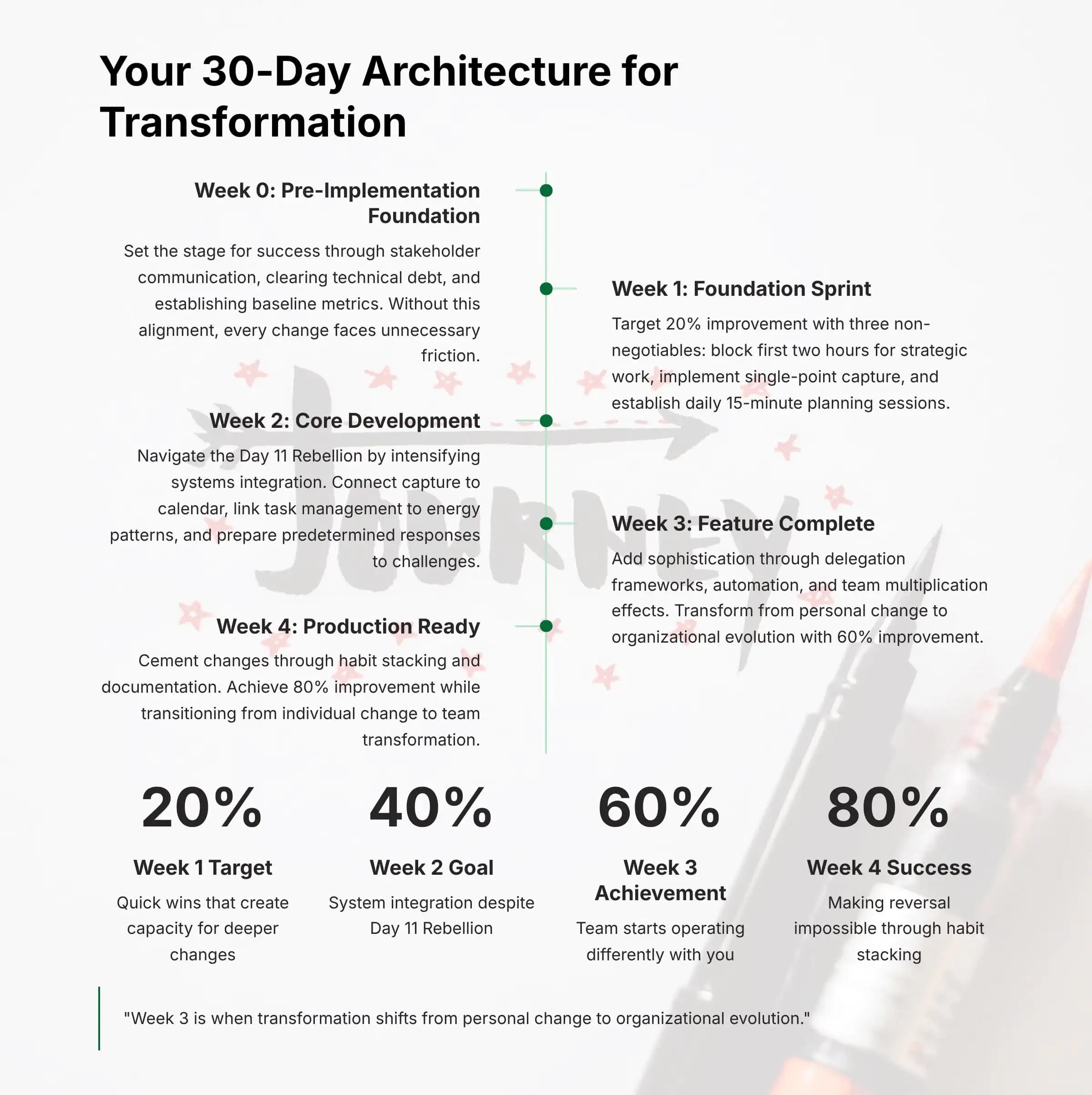 “Transformation isn’t about perfection in 30 days. It’s about reaching escape velocity—the point where maintaining new systems becomes easier than reverting to old ones.”